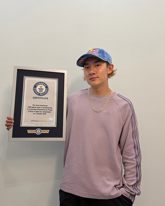 近日,苏翊鸣在今年10月7日完成的“背靠背1980”动作获得了吉尼斯世界纪录的官方认证,确认他创造了“一次连贯滑行内完成单板滑雪 1980 度转体次数最多”的吉尼斯世界纪录。在距离 2026 年米兰—科尔蒂纳冬奥会开赛仅剩数周之际,这项纪录不仅象征着技术的突破,更成为他调校心态、构建底气的重要支点。
